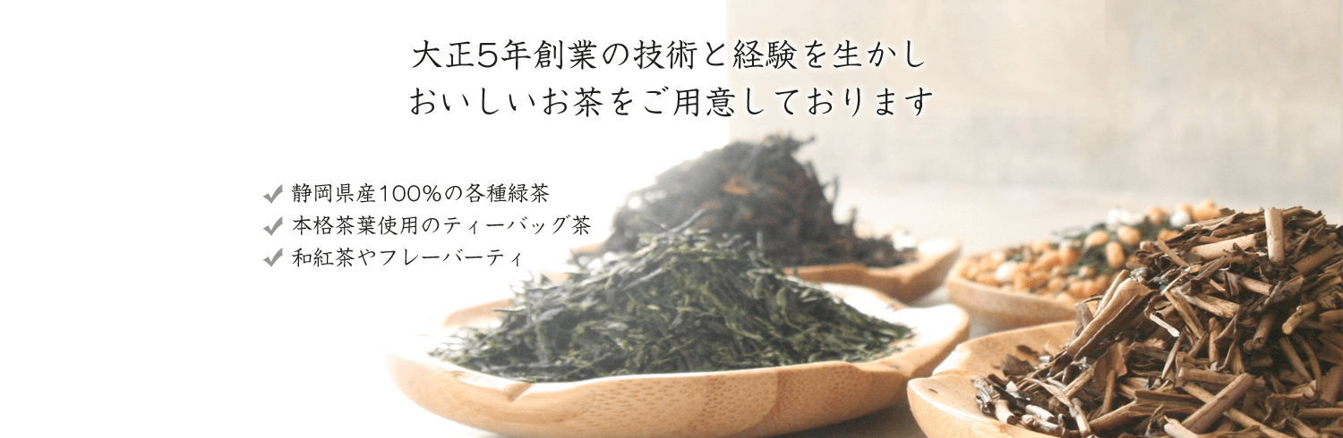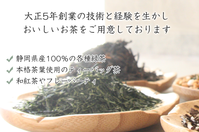 深蒸煎茶・浅蒸焙煎煎茶・玉露ほうじ茶・玄米茶・くき茶・芽茶など、全て100%静岡県産の茶葉を使用した緑茶をご用意しております。